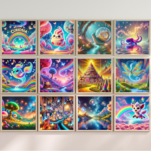 Scopri il cuore di Curiosia con questa tela incantata, ideale per decorare la cameretta dei bambini. Colline arcobaleno, foreste di zucchero filato e un cielo stellato illuminato da lucciole fanno da sfondo a creature buffe come il Fuffosauro e il Lumalampo. Perfetta per stimolare la fantasia dei più piccoli e portare un tocco di magia nel loro spazio.